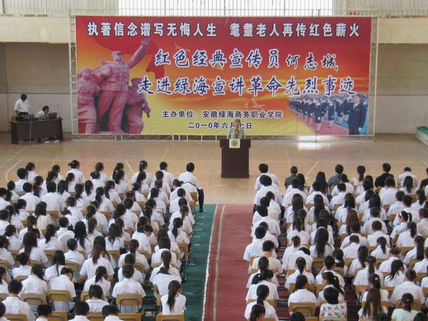繼5月8日紅色經(jīng)典宣傳員何志城老人來我院做革命先烈事跡報告后,在我院師生中產(chǎn)生強烈反響。6月7日,我院再度邀請何老登上綠海講壇,在全院范圍內(nèi)作更為廣泛、深入的報告。報告會在體育館二樓舉行,我院董事會、黨政領導及1000余名師生懷著滿腔的熱忱聆聽了何老的報告。