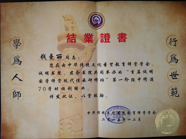 2015年12月5-12日,學(xué)生處處長(zhǎng)錢曼麗老師前往常州君合書院參加由中華傳統(tǒng)文化圣賢教育師資會(huì)、誠(chéng)明書院、君合書院共同舉辦的“首屆誠(chéng)明國(guó)學(xué)師資現(xiàn)代傳承研修班”第一階段的學(xué)習(xí),修滿70學(xué)時(shí),并順利結(jié)業(yè)。