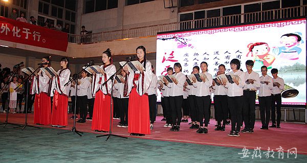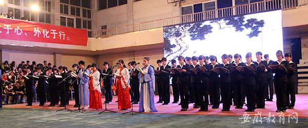 率先出場的代表隊,在古箏的伴奏下,同學(xué)們齊聲誦讀《弟子規(guī)》,意境深遠。“慈母手中線,游子身上衣。臨行密密縫,意恐遲遲歸。誰言寸草心,報得三春暉”。《游子吟》感人肺腑的場景告訴我們,莫要等到樹欲靜而心不止,子欲養(yǎng)而親不待,才后悔沒能盡到孝心;“愛我中華,傳承經(jīng)典”,響亮的口號在體育館響起,接著出場的是旅游系的同學(xué)們,“記得嗎,你祖先的名字叫炎黃?”提醒現(xiàn)代青年不忘祖先,樹立文化自信。吟誦穿插,在“泛愛眾”部分,用吟唱的形式表達,使整個現(xiàn)場氣氛達到高潮;大軍壓境,兩軍爭霸,仁孝在心頭,忠義不敢丟,少年岳飛,精忠報國,誦讀經(jīng)典,忠孝仁義,作為壓軸的信息系同學(xué),隨著口號,緩緩呈“義”字散開,與眾不同的是,他們實行傳統(tǒng)禮儀中的坐禮,這是一個大膽的決定,也是萬花從中一點綠,響亮的誦讀,默契的配合,使他們在過程中游刃有余,一曲終了,頂禮經(jīng)典……