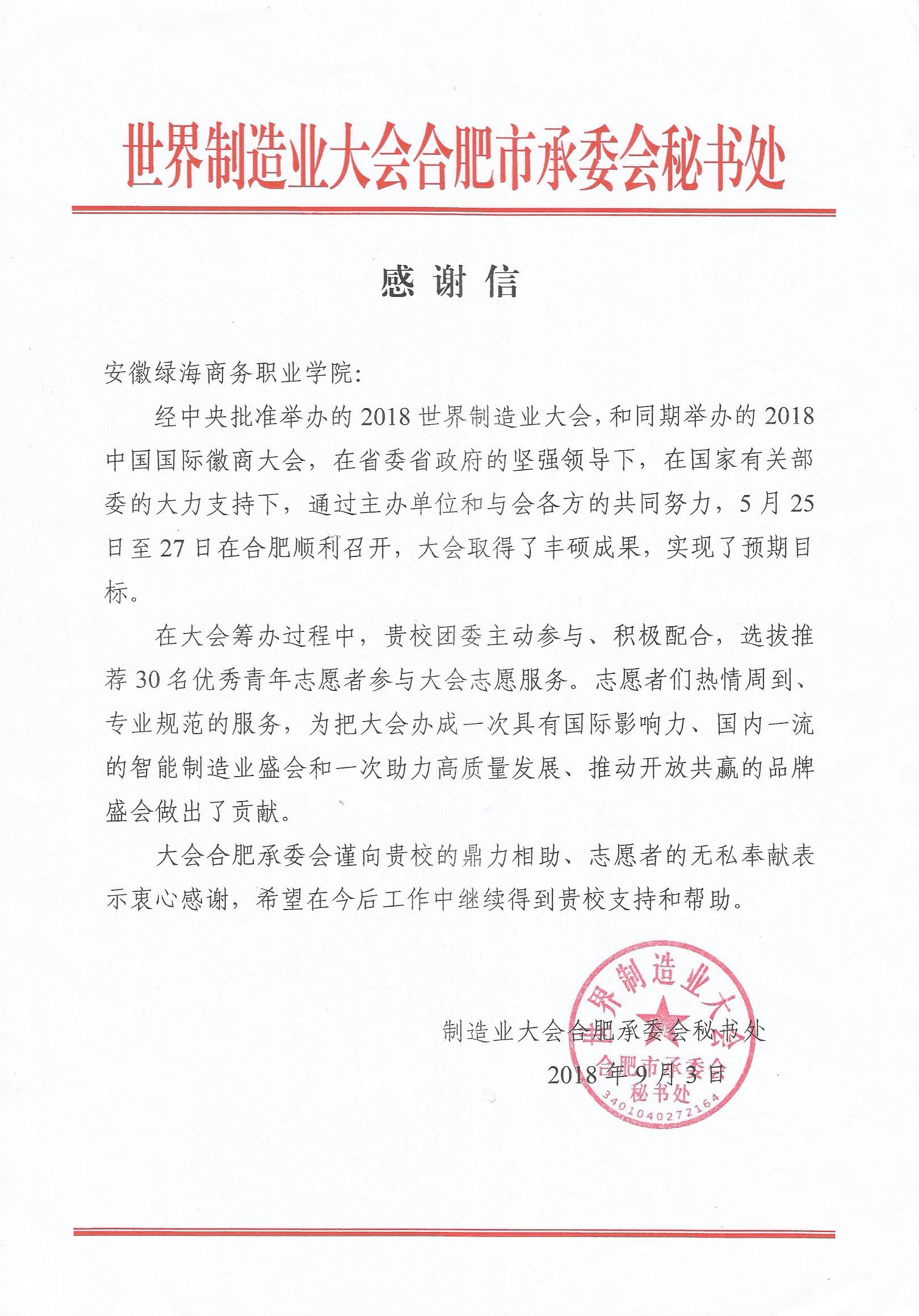 2018年5月,2018世界制造業(yè)大會暨2018國際徽商大會在合肥世界制造業(yè)大會在合肥召開,安徽綠海商務(wù)職業(yè)學(xué)院作為省內(nèi)唯一一所高職院校應(yīng)邀參與志愿服務(wù),30多名志愿者們熱情周到、專業(yè)規(guī)范的服務(wù),為把大會辦成一次具有國際影響力、國內(nèi)一流的智能制造業(yè)盛會做出了貢獻,受到承委會的感謝和贊揚,成為播種志愿文化和綠海文化的形象大使。