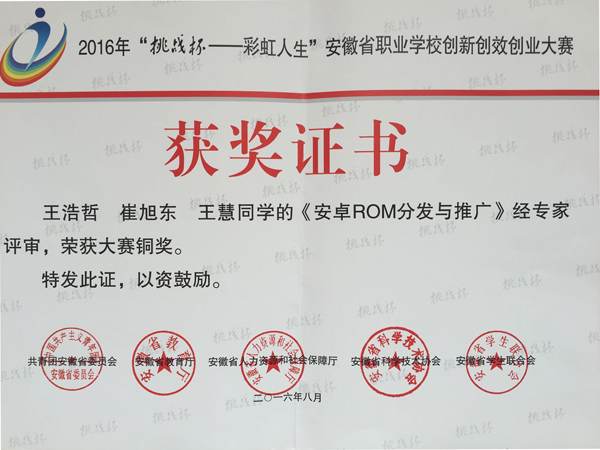 近日,從團(tuán)省委傳來喜訊,由團(tuán)省委、省教育廳、省人力資源和社會保障廳、省科協(xié)、省學(xué)聯(lián)聯(lián)合舉辦的2016年“挑戰(zhàn)杯——彩虹人生”安徽省職業(yè)學(xué)校創(chuàng)新創(chuàng)效創(chuàng)業(yè)大賽拉下帷幕。安徽綠海商務(wù)職業(yè)學(xué)院推報王浩哲、崔旭東、王慧三位同學(xué)的《安卓ROM分發(fā)與推廣》經(jīng)專家評審,榮獲大賽銅獎;同時該項目的指導(dǎo)老師徐俊梅、方萌萌、朱小明也在此次比賽中獲得優(yōu)秀指導(dǎo)老師稱號。