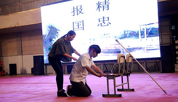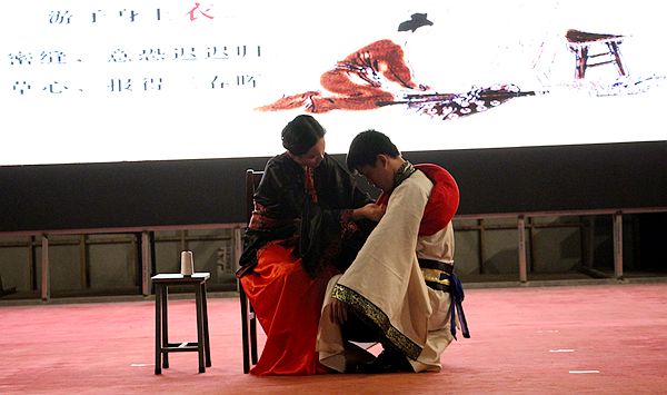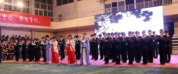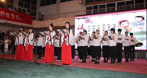 率先出場(chǎng)的代表隊(duì),在古箏的伴奏下,同學(xué)們齊聲誦讀《弟子規(guī)》,意境深遠(yuǎn)。“慈母手中線,游子身上衣。臨行密密縫,意恐遲遲歸。誰(shuí)言寸草心,報(bào)得三春暉”。《游子吟》感人肺腑的場(chǎng)景告訴我們,莫要等到樹(shù)欲靜而心不止,子欲養(yǎng)而親不待,才后悔沒(méi)能盡到孝心;“愛(ài)我中華,傳承經(jīng)典”,響亮的口號(hào)在體育館響起,接著出場(chǎng)的是旅游系的同學(xué)們,“記得嗎,你祖先的名字叫炎黃?”提醒現(xiàn)代青年不忘祖先,樹(shù)立文化自信。吟誦穿插,在“泛愛(ài)眾”部分,用吟唱的形式表達(dá),使整個(gè)現(xiàn)場(chǎng)氣氛達(dá)到高潮;大軍壓境,兩軍爭(zhēng)霸,仁孝在心頭,忠義不敢丟,少年岳飛,精忠報(bào)國(guó),誦讀經(jīng)典,忠孝仁義,作為壓軸的信息系同學(xué),隨著口號(hào),緩緩呈“義”字散開(kāi),與眾不同的是,他們實(shí)行傳統(tǒng)禮儀中的坐禮,這是一個(gè)大膽的決定,也是萬(wàn)花從中一點(diǎn)綠,響亮的誦讀,默契的配合,使他們?cè)谶^(guò)程中游刃有余,一曲終了,頂禮經(jīng)典……