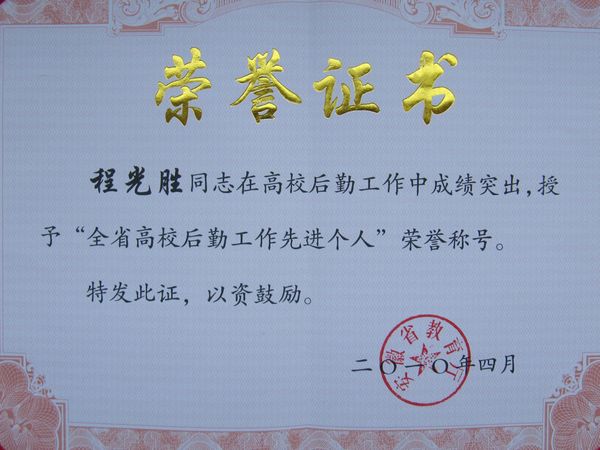 我院程光勝同志榮獲“全省高校后勤先進(jìn)個(gè)人”榮譽(yù)稱號(hào)
