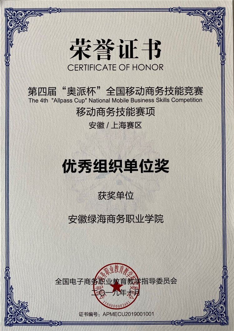 2、2019年11月,電商專業(yè)學(xué)生參加第四屆“奧派杯”全國(guó)移動(dòng)商務(wù)技能大賽,均獲安徽/上海賽區(qū)三等獎(jiǎng)