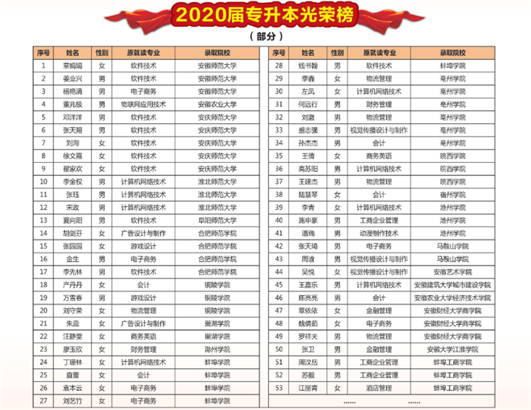 為滿足同學(xué)們的專升本需求,學(xué)院成立“專升本研究院”,與安徽知名專升本機(jī)構(gòu)合作,采取小班制教學(xué),定制化培養(yǎng),為學(xué)生參加專升本考試提供良好的學(xué)習(xí)氛國和可靠升學(xué)保障,學(xué)院2020屆畢業(yè)生專升本錄取人數(shù)占報(bào)考人數(shù)的55%,以下是部分學(xué)生錄取學(xué)校名單。