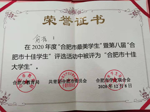 喜報(bào)|我院俞蓓同學(xué)獲評第八屆“合肥市十佳大學(xué)生”榮譽(yù)稱號
