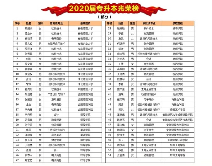 為滿足同學(xué)們的專升本需求,學(xué)院成立“專升本研究院”,與安徽知名專升本機構(gòu)合作,采取小班制教學(xué),定制化培養(yǎng),為學(xué)生參加專升本考試提供良好的學(xué)習(xí)氛國和可靠升學(xué)保障,學(xué)院2020屆畢業(yè)生專升本錄取人數(shù)占報考人數(shù)的55%,以下是部分學(xué)生錄取學(xué)校名單。