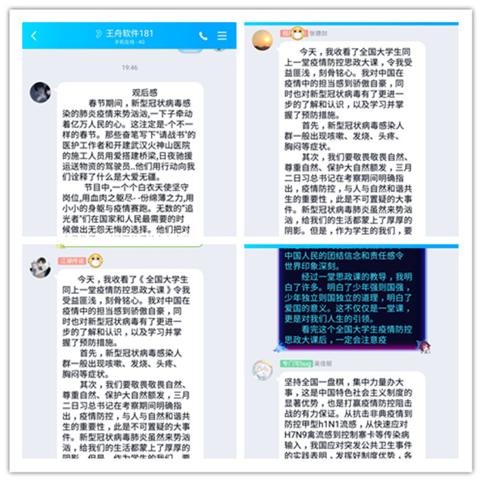 “疫情防控思政大課”結(jié)束后,全院師生在線進(jìn)行熱烈的交流討論,分享學(xué)習(xí)感悟。師生們一致認(rèn)為本堂“思政大課”深化了對抗擊疫情斗爭中的理論認(rèn)識,深刻認(rèn)識了領(lǐng)導(dǎo)和特色社會主義制度的顯著優(yōu)勢,加深了對于青年的責(zé)任與擔(dān)當(dāng)?shù)睦斫?,要自覺傳承和弘揚(yáng)愛國主義精神,并將之轉(zhuǎn)化為拼搏奮斗的思想和行為自覺。