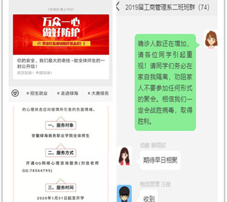 科學(xué)引導(dǎo)強信心。面對洶洶而來的疫情,學(xué)院自上而下,壓實責(zé)任鏈條,組織各級干部開展“拉網(wǎng)式”信息排查,要求輔導(dǎo)員精準(zhǔn)掌握每位學(xué)生思想狀態(tài)、身體狀況和活動軌跡等信息,及時匯總上報,對有外出史、出現(xiàn)感冒癥狀的學(xué)生重點關(guān)注。同時,重點關(guān)注家庭經(jīng)濟(jì)困難學(xué)生,及時回應(yīng)師生關(guān)切,細(xì)致解答各種問題。學(xué)院專門開通了線上心理支持服務(wù),引導(dǎo)師生穩(wěn)定情緒、堅定信心。同時通過互聯(lián)網(wǎng)短文、圖片、小視頻多種途徑和形式開展宣傳教育活動,增強學(xué)生戰(zhàn)“疫”必勝的信心。綠海學(xué)子被學(xué)院的真情所深深打動。