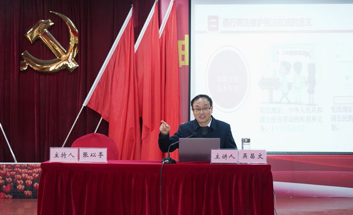 在宣講中,吳昌文通過向師生宣講我國憲法發(fā)展和完善的光輝歷程,突出學(xué)習(xí)貫徹習(xí)近平總書記法治思想主題,分析依憲治國與依法治國的關(guān)系、貫徹實施憲法與建設(shè)社會主義法治國家的關(guān)系等,重點闡述憲法對于依法治國,建設(shè)社會主義法治國家的重要價值與意義。報告接地氣、有溫度、語言鮮活,講準(zhǔn)、講透、講活憲法,既有理論高度,又有思想深度,使與會師生深化了對于憲法價值的認(rèn)知和對憲法精神的領(lǐng)悟。