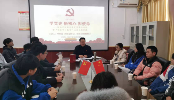為加強對學生黨員的教育管理,幫助新發(fā)展學生黨員進一步樹立黨員意識,保證黨員發(fā)展質(zhì)量,2021年12月11日上午9:00,在學院黨委黨員活動室,舉辦了與新發(fā)展的黨員和部分入黨積極分子集體談話。談話由紀委副書記、黨群工作部部長鄧奕成老師主持并做《學黨史、悟初心、擔使命》黨史學習教育主題黨課。