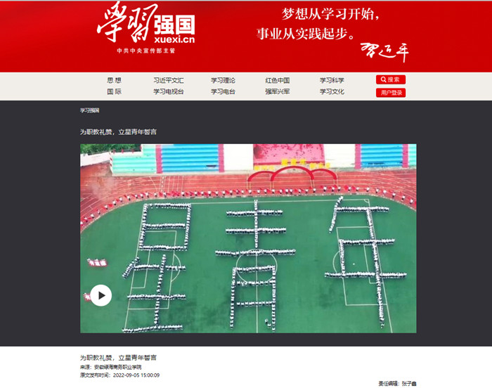 2022年9月初,安徽綠海商務(wù)職業(yè)學(xué)院職教青年,以一部《為職教禮贊 立星青年誓言》專題片再度刷爆網(wǎng)絡(luò),再次登錄《學(xué)習(xí)強(qiáng)國(guó)》,展現(xiàn)吾輩職教青年青春風(fēng)采。