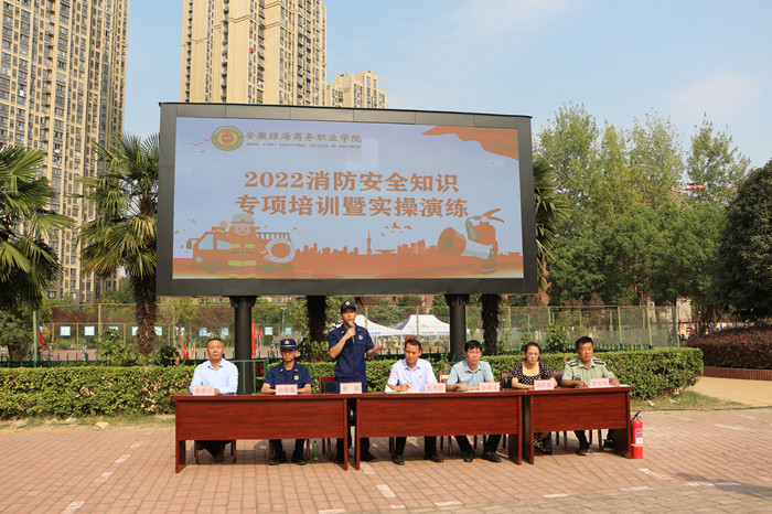 為進(jìn)一步強化和提升師生消防安全意識和避險自救能力,提高對突發(fā)火災(zāi)事故的快速反應(yīng)及處置能力。9月26日下午,安徽綠海商務(wù)職業(yè)學(xué)院聯(lián)合轄區(qū)消防救援大隊共同在學(xué)院科技樓廣場開展2022消防安全知識培訓(xùn)暨實操演練活動。學(xué)院黨委委員、常務(wù),合肥經(jīng)開區(qū)消防救援大隊夏超教官,學(xué)生處、保衛(wèi)處、征兵工作站、宣傳部等相關(guān)處室負(fù)責(zé)人,大一新生及輔導(dǎo)員、后勤食堂工作人員等參加。學(xué)院副院長張忠文主持活動。