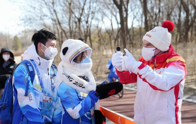 國(guó)際奧委會(huì)主席托馬斯·巴赫(右)在火炬?zhèn)鬟f前與志愿者交流。新華社記者 鞠煥宗 攝