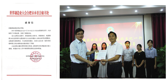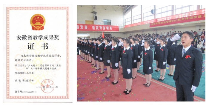 (左圖為學(xué)院星青年人才培養(yǎng)模式獲安徽省教學(xué)成果二等獎(jiǎng);右圖為赴世博會(huì)服務(wù)的綠海學(xué)子整裝待發(fā))