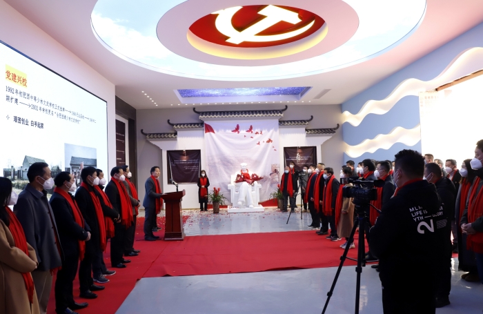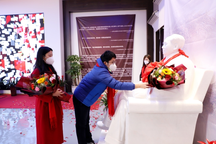 陳孝云董事長、許信旺執(zhí)行院長共同為毛澤東同志雕像揭幕。兩位教師代表向毛澤東同志雕像敬獻鮮花。全體人員肅立并向毛澤東同志雕像三鞠躬,表達深切緬懷之情。