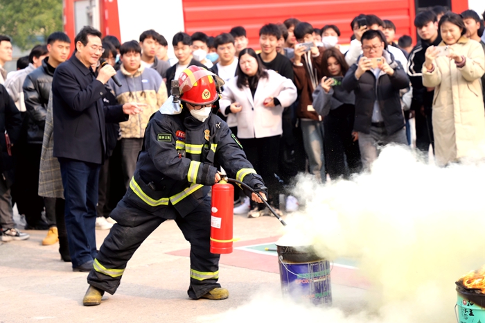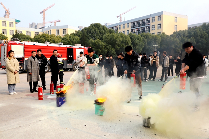 演練現(xiàn)場,黃宣銘教官針對突發(fā)火情時如何正確做好個人防護,保持冷靜,克服驚慌、恐懼心理,掌握逃生要領(lǐng),正確選擇逃生途徑,減少煙、火危害,熟悉疏散路線、集結(jié)點等進行詳細講解。隨后,教官現(xiàn)場指導(dǎo)學(xué)生代表使用滅火器具進行實際操作演練。