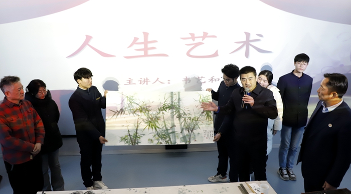 吳珉對韋老師的創(chuàng)作經(jīng)歷和成果進(jìn)行了詳細(xì)介紹后,韋藝和老師以《人生藝術(shù)》為主題展開講座,他語言風(fēng)趣幽默又熱情洋溢,從創(chuàng)作背景、取材、體會等方面,生動詮釋了繪畫與時代、審美、表現(xiàn)上的意義與關(guān)系。“我和竹子關(guān)系很好”,他動情地講述了他對竹子有著一份異于常人的愛戀和癡迷,愛竹、畫竹、做竹是他人生里的三張境界,與竹共舞是一種幸福。他分享了自身創(chuàng)作經(jīng)歷,對所創(chuàng)作的繪畫作品從內(nèi)涵到形式進(jìn)行了解析,他用詩人的情懷,將真情、詩意融入作品之中,以文學(xué)的語言、書法的線條傳達(dá)美的信息。
