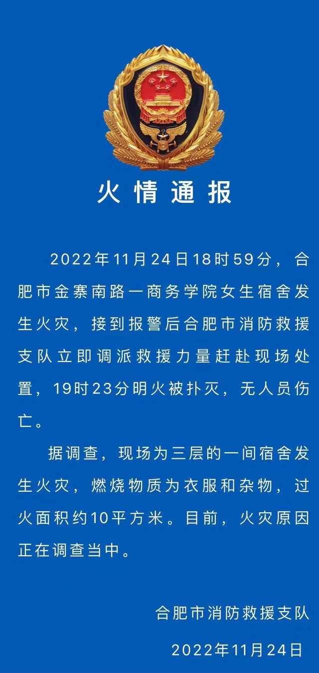 2022年11月24日18時59分,學院一名女生因使用大功率電器引發(fā)火情。經學院和合肥市消防救援支隊現場處置后,19時23分明火被撲滅,人員全部疏散完畢,無人員傷亡。目前所有學生已妥善安置,火災原因消防部門正在進一步調查中。