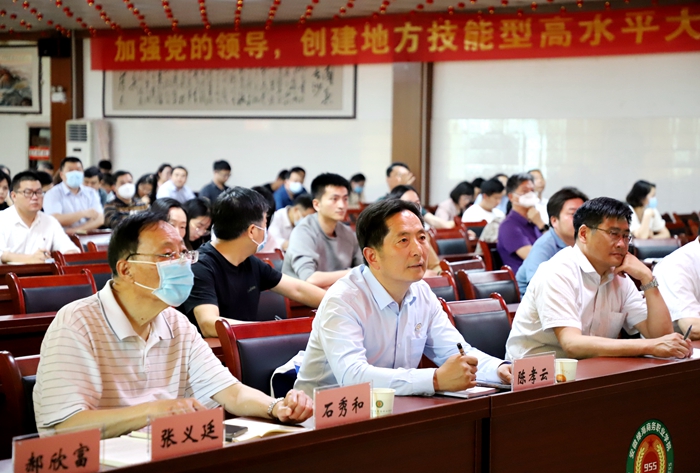 為進(jìn)一步提升全體教職員工的專(zhuān)業(yè)能力和綜合素質(zhì),更好地推動(dòng)學(xué)?!半p高”建設(shè)工作,5月19日下午,學(xué)校黨委、董事會(huì)特邀中國(guó)高等教育學(xué)會(huì)職業(yè)技術(shù)教育分會(huì)會(huì)長(zhǎng)、知名職教專(zhuān)家、浙江金融職業(yè)學(xué)院發(fā)展咨詢(xún)委員會(huì)主任、安徽綠海商務(wù)職業(yè)學(xué)院專(zhuān)家指導(dǎo)委員會(huì)副主任周建松教授蒞臨,為綠海學(xué)院高等職業(yè)教育研究中心揭牌并作《雙高目標(biāo)下的關(guān)鍵能力建設(shè)》專(zhuān)題報(bào)告。學(xué)校黨政領(lǐng)導(dǎo)陳孝云、石秀和、劉興杰、常務(wù)副院長(zhǎng)、江傳瑞、陳藝?guó)Q,全體教職員工聆聽(tīng)報(bào)告,報(bào)告由執(zhí)行校長(zhǎng)許信旺主持。