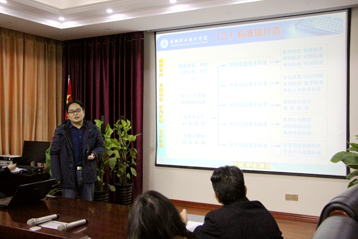 為促進學(xué)院內(nèi)涵建設(shè),深化教育教學(xué)改革,進一步推動教學(xué)診斷與改進工作,12月10日下午,安徽綠海商務(wù)職業(yè)學(xué)院邀請安徽職業(yè)技術(shù)學(xué)院謝暴教授就學(xué)院內(nèi)部質(zhì)量保證體系診斷與改進工作進行專題培訓(xùn)。培訓(xùn)會由執(zhí)行院長亓四華教授主持,學(xué)院相關(guān)領(lǐng)導(dǎo)和各部門負責(zé)人、教研室主任等參會。