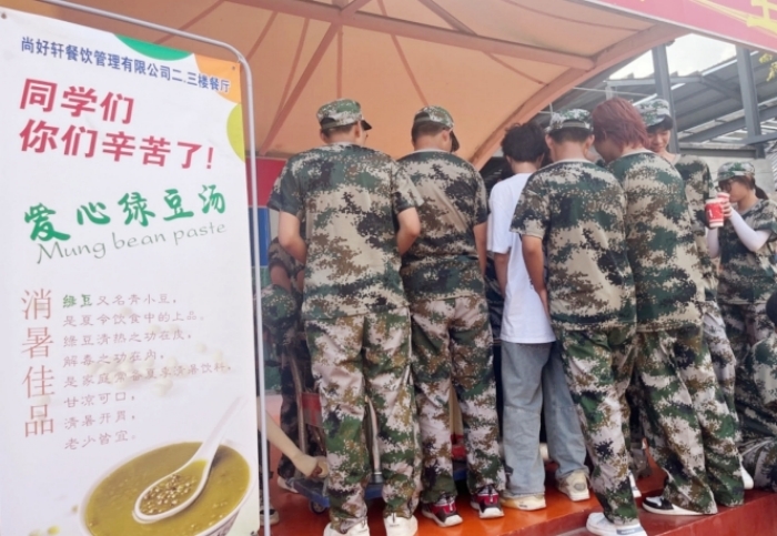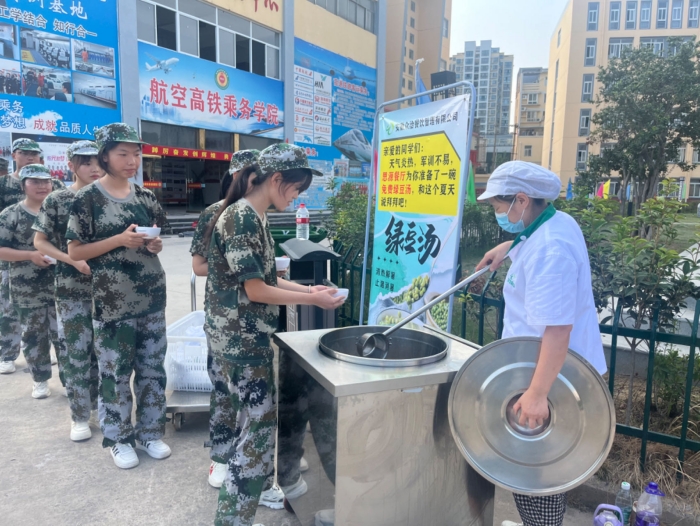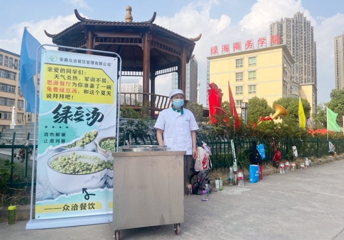 正值大一新生軍訓(xùn)期間,室外烈日灼灼,為給軍訓(xùn)學(xué)員降溫、解暑,學(xué)??倓?wù)處特安排一樓食堂、二樓食堂分別在體育場(chǎng)和籃球場(chǎng)兩個(gè)訓(xùn)練場(chǎng)地每天上午、下午設(shè)置愛(ài)心綠豆湯發(fā)放點(diǎn),為軍訓(xùn)學(xué)員及教官免費(fèi)發(fā)放綠豆湯。