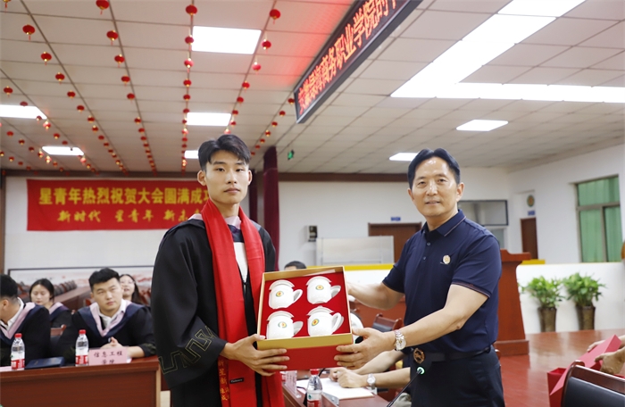 陳孝云董事長做總結(jié)講話并給畢業(yè)生代表贈送畢業(yè)禮物。他強調(diào),習近平總書記在黨的二十大報告中寄語廣大青年“立志做有理想、敢擔當、能吃苦、肯奮斗的新時代好青年”。這是黨的領袖對青年一代的殷切期望,為新時代中國青年樹立了精神的旗幟、照亮了前進的方向。綠海星青年要時刻拿這四條標準對標對表找差距,勇做新時代的先鋒隊、生力軍、排頭兵。他向同學們發(fā)出畢業(yè)三問,一是“走出校門你被認可嗎?”二是“面對社會你有信心嗎?”三是“你有沒有很自豪的告訴別人自己是綠海學子?”最后,陳老師分享了星青年成長成才“通道”和“基因密碼”,以及五項管理和五種能力,希望同學們認真領悟星青年文化內(nèi)涵,在新的人生道路上做時代星青年,為實現(xiàn)中華民族偉大復興貢獻自己的力量。