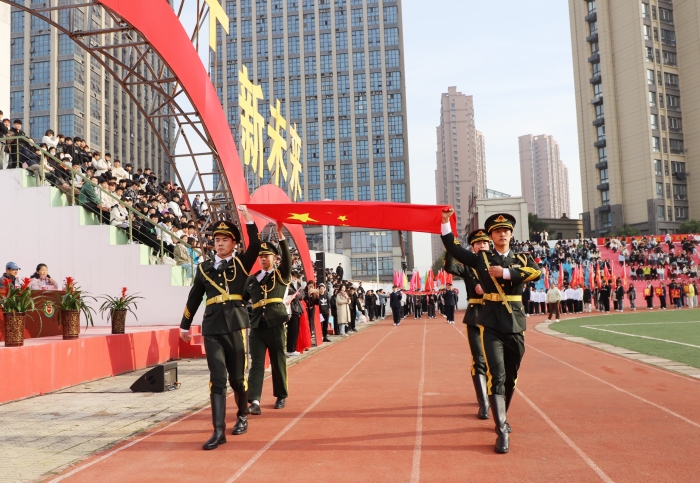 各代表隊(duì)入場(chǎng)后,在雄壯的國(guó)歌聲中,大會(huì)舉行了莊嚴(yán)的升旗儀式,全場(chǎng)師生齊唱國(guó)歌。