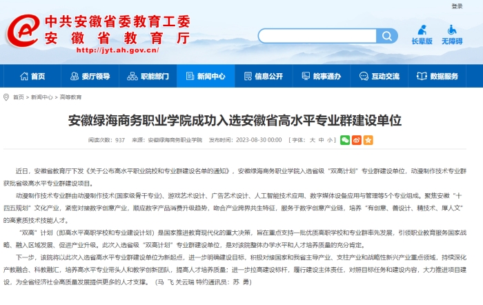三是堅持內(nèi)涵建設,教學改革不斷深入。綠海學院入選省級“雙高計劃”專業(yè)群建設單位,動漫制作技術(shù)專業(yè)群獲批省級高水平專業(yè)群建設項目;2021年以來獲批省級課題52項;1+X證書專業(yè)獲證率60%;2本教材入選首批“十四五”職業(yè)教育國家規(guī)劃教材,省級精品在線開放課程開設9門,編輯出版數(shù)字化教材9冊,全力打造《中華優(yōu)秀傳統(tǒng)文化傳承與星青年文化創(chuàng)新專業(yè)教學資源庫》;專業(yè)設置與安徽省區(qū)域重點產(chǎn)業(yè)匹配度達到89%,積極對接國家重大戰(zhàn)略和服務安徽經(jīng)濟發(fā)展。