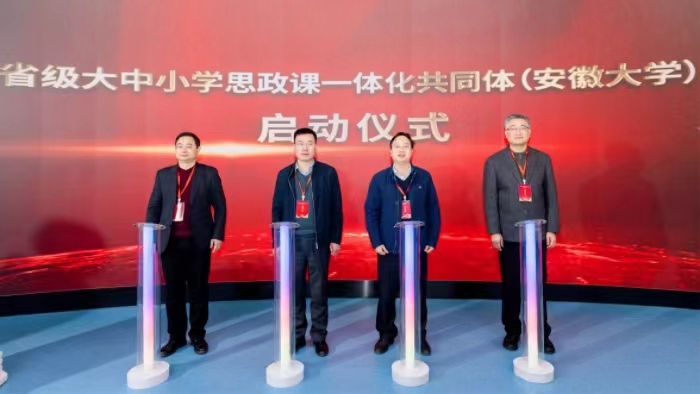 安徽大學(xué)黨委常委、副校長黃志祥,合肥市教育局副局長張藝國、合肥教科院院長葉傳平、安徽大學(xué)教務(wù)處處長李學(xué)俊按下啟動桿,共同啟動省級大中小學(xué)思政課一體化共同體(安徽大學(xué))。