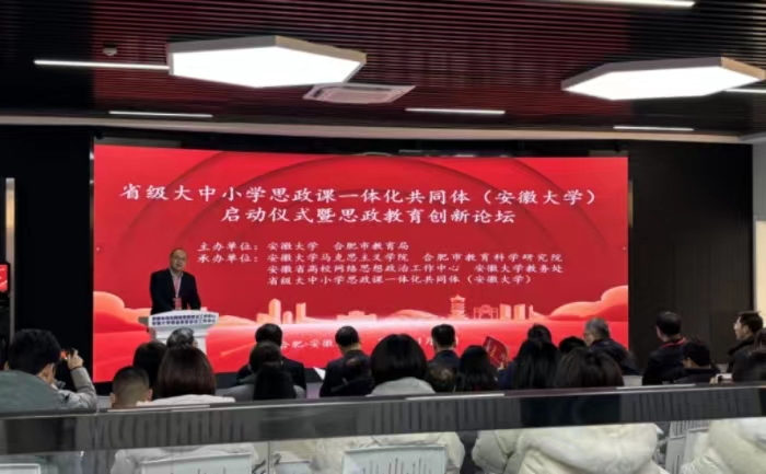 1月26日上午,安徽省大中小學(xué)思政課一體化共同體(安徽大學(xué))啟動儀式暨思政教育創(chuàng)新論壇于安徽大學(xué)磬苑校區(qū)舉行。我校馬克思主義學(xué)院院長喻小紅,馬克思主義學(xué)院“習(xí)近平新時代中國特色社會主義思想概論”教研室主任馬雙雙受邀參加此次活動。本次啟動儀式暨創(chuàng)新論壇由安徽大學(xué)和合肥市教育局主辦,安徽大學(xué)馬克思主義學(xué)院、合肥市教育科學(xué)研究院、安徽省高校網(wǎng)絡(luò)思想政治工作中心、安徽大學(xué)教務(wù)處等共同承辦。