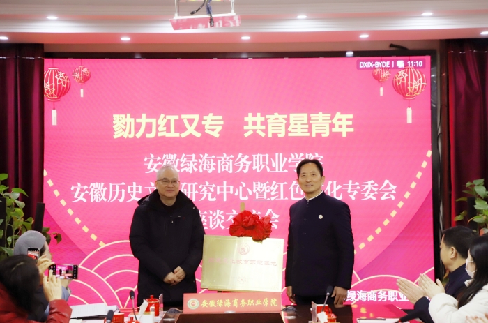 座談會(huì)之前,呂杰主持頒授牌匾儀式。他簡(jiǎn)要介紹了安徽歷史文化研究中心紅委會(huì)機(jī)構(gòu)設(shè)置、研究方向、開發(fā)推廣的項(xiàng)目等情況,并指出,再次來(lái)到綠海學(xué)院,深切感受到學(xué)校的新發(fā)展、新成就、新氣象,對(duì)學(xué)院辦學(xué)育人取得的豐碩成果表示衷心祝賀。長(zhǎng)期以來(lái),安徽綠海商務(wù)職業(yè)學(xué)院堅(jiān)持為黨育人、為國(guó)育才,高度重視傳承弘揚(yáng)紅色文化,深入開展紅色文化教育活動(dòng),全面拓展紅色文化教育基地,大力進(jìn)行紅色文化感悟踐行,引領(lǐng)星青年樹立遠(yuǎn)大理想、培育高尚道德、鍛造堅(jiān)強(qiáng)意志,在用紅色文化立德樹人方面發(fā)揮了引領(lǐng)示范作用。