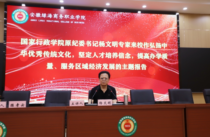 5月22日,國家行政學院原紀委書記、十八屆中央巡視組組長楊文明,教育部高教司原巡視員、全國高等教育教學評估中心主任劉鳳泰,《中國教育報刊社》原社長、中國職業(yè)技術教育學會常務副會長、黨建工作委員會主任李曜升等一行5人蒞臨我校指導工作并分別作“弘揚中華優(yōu)秀傳統(tǒng)文化、堅定人才培養(yǎng)信念、提高辦學質(zhì)量、服務區(qū)域經(jīng)濟發(fā)展”、“以評促建、評建結合、重在建設、提高人才培養(yǎng)質(zhì)量”,“把握局勢律,推動職業(yè)教育高質(zhì)量發(fā)展”主題報告。學校領導、全體教職員工聆聽報告,報告會由安徽綠海商務職業(yè)學院董事長、黨委副書記、安徽數(shù)字創(chuàng)意職教集團理事長、星青年文化研究院院長陳孝云主持。