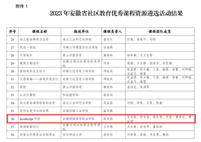 近日,安徽省教育廳公布了2023年社區(qū)教育優(yōu)秀課程資源遴選結(jié)果,我校信息工程學(xué)院由徐多蔚老師負(fù)責(zé)的《JavaScript開(kāi)發(fā)》一門課程成功入選,本次入選的課程資源,將在“安徽全民終身學(xué)習(xí)網(wǎng)”平臺(tái),面向社會(huì)學(xué)習(xí)者開(kāi)放共享。