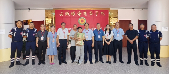 圖為程雅琴父女和阜南公益救援隊與安徽綠海商務(wù)學(xué)院領(lǐng)導(dǎo)老師合照