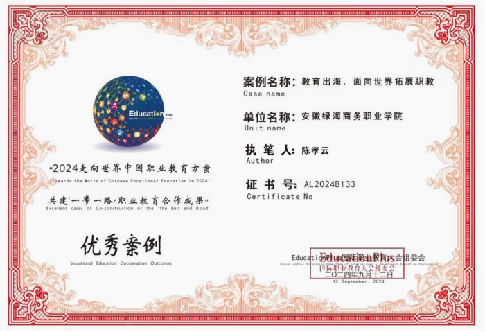 在大會(huì)開幕式上,安徽綠海商務(wù)職業(yè)學(xué)院學(xué)院入選“世界技能發(fā)展聯(lián)盟會(huì)員單位”,申報(bào)的《教育出海,面向世界發(fā)展職教》案例榮獲“2024走向世界中國職業(yè)教育方案——共建‘一帶一路’職業(yè)教育合作成果”優(yōu)秀案例。
