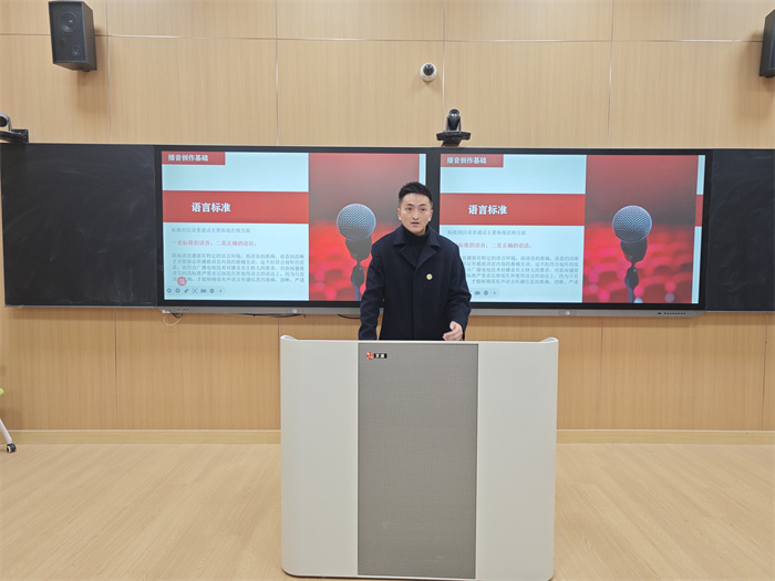 楊杰老師主要從播音標準、表達規(guī)范、播報態(tài)度三個方面進行了理論講解和實戰(zhàn)培訓。楊杰老師首先強調(diào)要注重語言的基本功練習。無論是新聞播報、節(jié)目主持還是其他形式的播音工作,都需要清晰、準確、流暢的語言表達。只有掌握扎實的語言基本功,才能在面對各種復(fù)雜的播音任務(wù)時游刃有余,確保信息的準確傳遞。