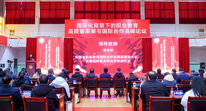 安徽省職業(yè)教育國際發(fā)展聯(lián)盟秘書長、安徽國際商務(wù)職業(yè)學(xué)院黨委委員、副校長凌雙英為大會致辭。