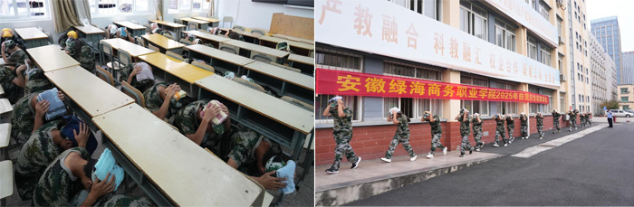 14:30,參演師生轉(zhuǎn)場(chǎng)至教學(xué)樓教室,隨著模擬“地震”警報(bào)信號(hào)發(fā)出,學(xué)生按照地震應(yīng)急避險(xiǎn)要求,迅速蹲下,蜷曲身體,降低身體重心,雙手護(hù)頭,就近躲在課桌下進(jìn)行避震。 隨著疏散指令發(fā)出,師生雙手護(hù)頭按照預(yù)定疏散路線,快速、有序的撤離教學(xué)樓向指定集合點(diǎn)疏散。同時(shí),輔導(dǎo)員、保衛(wèi)人員、軍訓(xùn)教官在樓道、樓梯口等處加以指引、疏導(dǎo),防止出現(xiàn)擁擠、踩踏。師生全部安全撤離到指定疏散集合點(diǎn)。