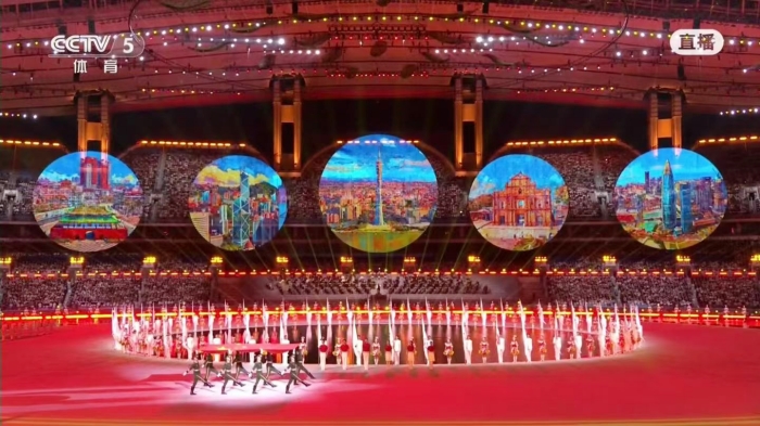開幕式現(xiàn)場(chǎng),這幅長(zhǎng)達(dá)174米的數(shù)字畫卷以9塊圓形屏幕聯(lián)動(dòng)呈現(xiàn),生動(dòng)描繪出廣州塔“小蠻腰”、港珠澳大橋、澳門大三巴牌坊等粵港澳大灣區(qū)標(biāo)志性景觀。畫面既保留了油畫的厚重質(zhì)感,又融入數(shù)字藝術(shù)的靈動(dòng)韻律,充分詮釋了開幕式“山水相依、風(fēng)土同源”的藝術(shù)主題。
