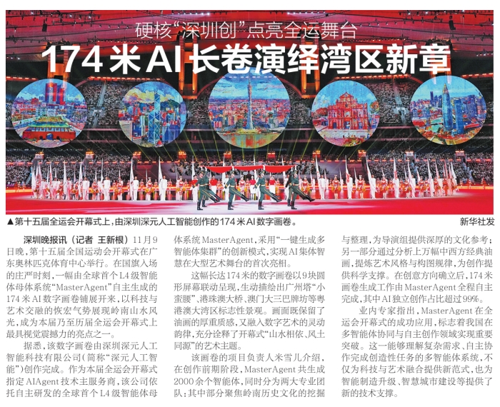 據(jù)悉,該數(shù)字畫卷由深圳深元人工智能科技有限公司(簡(jiǎn)稱“深元人工智能”)創(chuàng)作完成。作為本屆全運(yùn)會(huì)開幕式指定AI Agent技術(shù)主服務(wù)商,該公司依托自主研發(fā)的全球首個(gè)L4級(jí)智能體母體系統(tǒng)MasterAgent,采用“一鍵生成多智能體集群”的創(chuàng)新模式,實(shí)現(xiàn)AI集體智慧在大型藝術(shù)舞臺(tái)的首次亮相。
