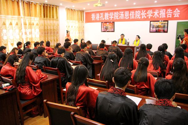 典禮后,湯恩佳為綠海學(xué)院師生作學(xué)術(shù)報告,湯恩佳從孔教儒學(xué)復(fù)興為時代所需、儒學(xué)儒教并行不悖以及大學(xué)教育中應(yīng)如何開展傳統(tǒng)文化教育三個方面做了演講。希望大家共同傳播儒家文化的精髓,讓博大精深的傳統(tǒng)文化發(fā)揚(yáng)光大。