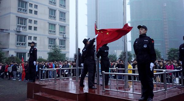 晨曦中,一身戎裝、威儀整齊的國(guó)旗護(hù)衛(wèi)隊(duì)鏗鏘邁步,擎旗、升旗一氣呵成。注目禮中,師生,嘹亮的國(guó)歌聲中五星紅旗冉冉升起。