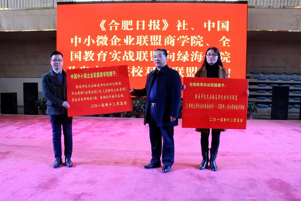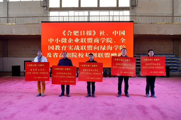 期間,合肥日報社分別向安徽財貿(mào)職業(yè)學院、安徽綠海商務職業(yè)學院、安徽工商職業(yè)學院、徽商職業(yè)學院、合肥科技職業(yè)學院等五所安徽高職院校雙創(chuàng)聯(lián)盟成員單位贈予了2016年度《合肥日報》20份。中小微企業(yè)聯(lián)盟商學院、全國教育實戰(zhàn)聯(lián)盟贈分別贈予安徽綠海商務職業(yè)學院及安徽高職院校雙創(chuàng)聯(lián)盟,職業(yè)經(jīng)理《招商演說》及《互聯(lián)網(wǎng)立體營銷》落地系統(tǒng)課程各3期,每期60個培訓名額;21世紀大學生成功黃金法則——互聯(lián)網(wǎng)+逆向思維培訓課程。