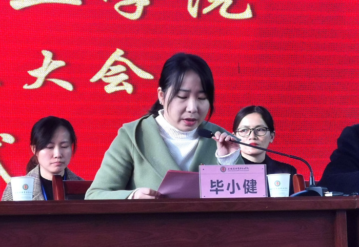 畢小健代表團(tuán)市委、市學(xué)聯(lián)向大會的召開表示祝賀。畢小健在講話中充分肯定了我院近年來團(tuán)學(xué)工作所取得的成績,并就進(jìn)一步推進(jìn)團(tuán)學(xué)工作提出四點希望:要進(jìn)一步強(qiáng)化對青年學(xué)生的思想引領(lǐng)。引導(dǎo)和影響青年學(xué)生不斷增進(jìn)思想認(rèn)同,進(jìn)一步堅定跟著黨走特色社會主義道路的共同理想信念,是學(xué)生組織的重要任務(wù);要進(jìn)一步強(qiáng)化對青年學(xué)生的力量凝聚。增強(qiáng)學(xué)生會對廣大同學(xué)的凝聚力,是學(xué)生會體現(xiàn)自身性質(zhì)的必然要求,也是學(xué)生會提升自身作用的內(nèi)在需求;要進(jìn)一步強(qiáng)化對青年學(xué)生的成長服務(wù)。學(xué)生會要牢固樹立以學(xué)生為本的工作理念,緊緊圍繞廣大青年學(xué)生在學(xué)習(xí)教育、文化生活、社會參與和權(quán)益維護(hù)等方面表現(xiàn)出的不同利益需求,廣泛開展?jié)е鷮W(xué)、結(jié)對幫扶、就業(yè)見習(xí)等活動;要進(jìn)一步強(qiáng)化對青年學(xué)生的組織覆蓋,只有加強(qiáng)學(xué)生會的自身建設(shè),擴(kuò)大對青年學(xué)生的組織覆蓋,才能增強(qiáng)學(xué)生會對青年學(xué)生的功能覆蓋、服務(wù)覆蓋和影響力覆蓋。