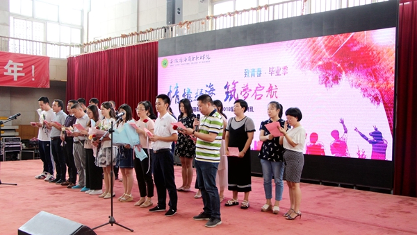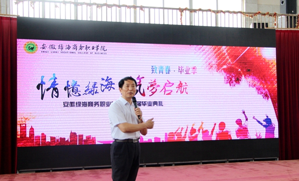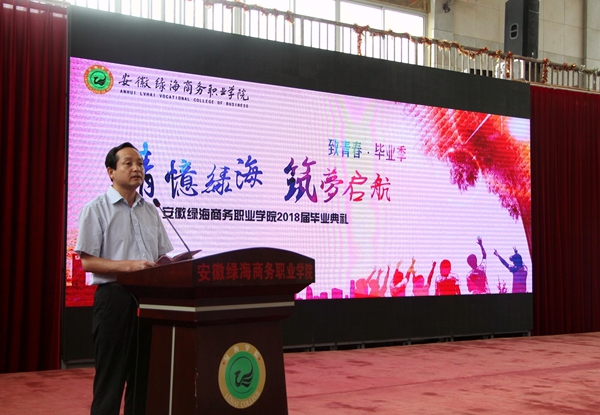 近日,安徽綠海商務(wù)職業(yè)學(xué)院2018屆畢業(yè)典禮在體育館二樓大禮堂隆重舉行,學(xué)院董事長陳孝云、黨委書記江傳瑞、院長徐建平教授、副院長陳孝江、院長助理余敏教授、院長助理席清才教授,相關(guān)部門負(fù)責(zé)人,各班級輔導(dǎo)員、教師代表,全體畢業(yè)生及部分往屆優(yōu)秀畢業(yè)生代表參加典禮,黨委副書記張以亭主持大會。在嘹亮的國歌聲中畢業(yè)典禮拉開了序幕。