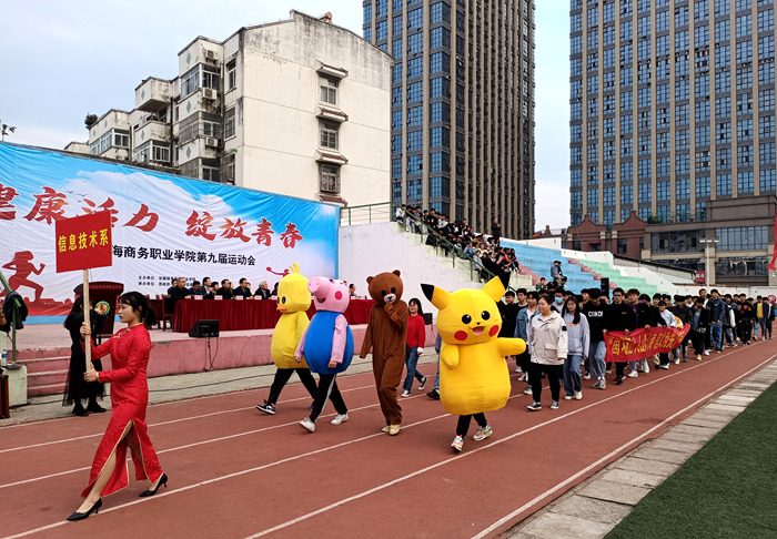 隨后,各系運(yùn)動(dòng)員方陣陸續(xù)登場(chǎng),他們踏著鏗鏘的節(jié)奏,邁著堅(jiān)定的步伐,氣宇軒昂、意氣風(fēng)發(fā),嘹亮的口號(hào)喊出了師生們高昂的斗志。各方陣在入場(chǎng)秀上腦洞大開(kāi),形式多樣、個(gè)性張揚(yáng)。有古風(fēng)雅韻漢服秀、有職業(yè)風(fēng)采禮儀秀、有活潑可愛(ài)玩偶秀,還有現(xiàn)代科技無(wú)人機(jī)的助陣……創(chuàng)意入場(chǎng)充分展示了各系的特色及教學(xué)成果,成為塑膠運(yùn)動(dòng)場(chǎng)上一道道亮麗的風(fēng)景。