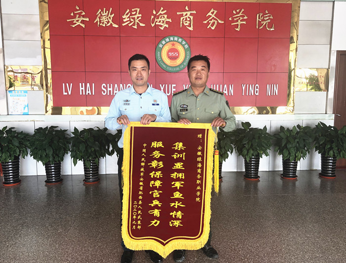 10月13日上午,肥西縣人民武裝部保障科科長(zhǎng)馬家文一行將“服務(wù)彰保障官兵有力 集訓(xùn)顯擁軍魚水情深”的錦旗送至安徽綠海商務(wù)職業(yè)學(xué)院,為學(xué)院積極配合縣武裝部2020年度入伍新兵役前訓(xùn)練提供場(chǎng)地并在集訓(xùn)中提供的優(yōu)質(zhì)服務(wù)表示感謝,也對(duì)學(xué)院長(zhǎng)期以來積極開展國(guó)防教育以及雙擁工作表示肯定。