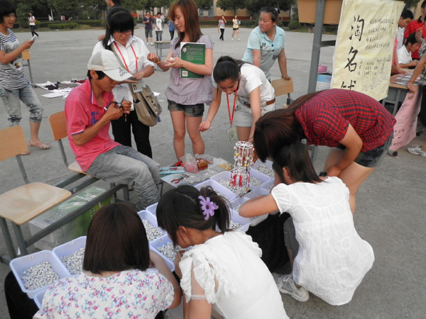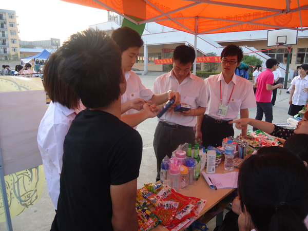 大賽現(xiàn)場,每一組參賽人員都把自己的展臺(tái)設(shè)計(jì)成不同的風(fēng)格,展臺(tái)上擺放著同學(xué)們密切相關(guān)的商品。在課間,很多同學(xué)到大賽現(xiàn)場觀看和購買商品,短短幾分鐘籃球場便成了一條熱鬧的商業(yè)街。晚上,在朦朧的燈光下,同學(xué)們的身影在不同的展臺(tái)中穿梭,營造了商業(yè)市場的夜市氛圍。