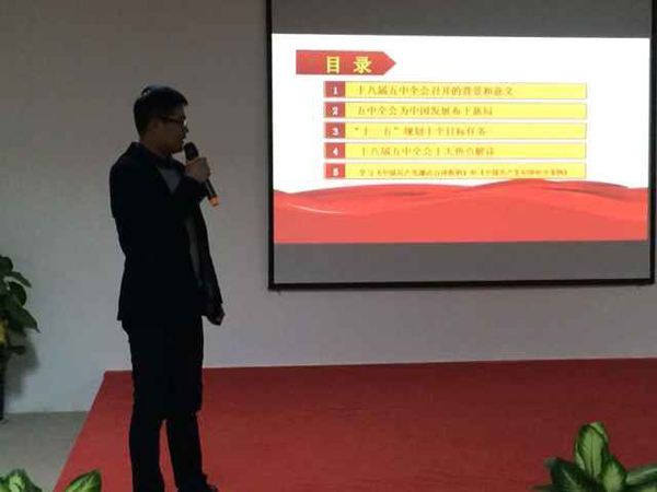 高明首先為學(xué)生黨員、入黨積極分子介紹了十八屆五中全會(huì)召開的背景和意義,指出深入學(xué)習(xí)全會(huì)提出的“十三五”時(shí)期我國發(fā)展的指導(dǎo)思想、基本原則、目標(biāo)要求、基本理念、重大舉措,這是黨在新的歷史條件下深化改革開放、加快推進(jìn)社會(huì)主義現(xiàn)代化提供了科學(xué)指導(dǎo)和行動(dòng)指南。當(dāng)前,我國發(fā)展既面臨大有作為的重大戰(zhàn)略機(jī)遇期,也面臨諸多矛盾相互疊加的嚴(yán)峻挑戰(zhàn);隨后他對(duì)“十三五”規(guī)劃中的十個(gè)目標(biāo)任務(wù)做了具體說明,同時(shí)就十八屆五中全會(huì)十大熱點(diǎn)問題進(jìn)行了解讀,讓入黨積極分子們充分認(rèn)識(shí)到十八屆五中全會(huì)召開的重要性。